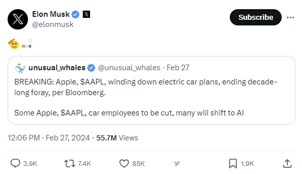 Apple is getting out of the autonomous electric car business. TechCrunch says that hundreds of employees working on the project will lose their jobs and that all work has stopped. The initial announcement was made internally earlier this week but ending a 10-year effort seen as part of Apple’s growth strategy is not something you can keep quiet. Project Titan as it was called, was never officially announced, and the company may never officially announce that it has been unplugged (the BBC couldn’t resist the headline). Investors seem to have welcomed the news because the stock was up at the close in New York, but the Wall Street Journal says those investors are still waiting to hear the company’s AI strategy. Elon Musk was certainly pleased to see Apple pull away from the car business. He saluted the news and lit a cigarette - figuratively on X of course: